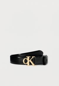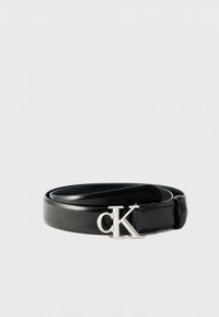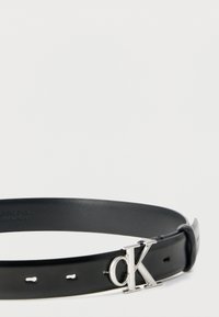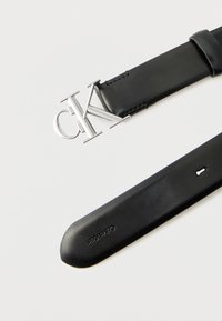 Μαύρη δερμάτινη ζώνη τυλιγμένη με αγκράφα λογότυπο "cK" σε ασημί, εμφανιζόμενη σε απλό φωτεινό φόντο.