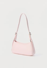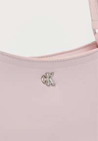 Μικρή ροζ ώμου τσάντα σε παστέλ απόχρωση με λεπτό λουράκι και ασημί λογότυπο "CK" στο κέντρο πάνω σε μονόχρωμο φόντο.