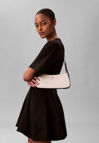 Νεαρή γυναίκα με μαύρο φόρεμα που κρατάει μια μικρή λευκή τσάντα ώμου Calvin Klein σε γκρι φόντο.