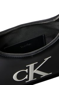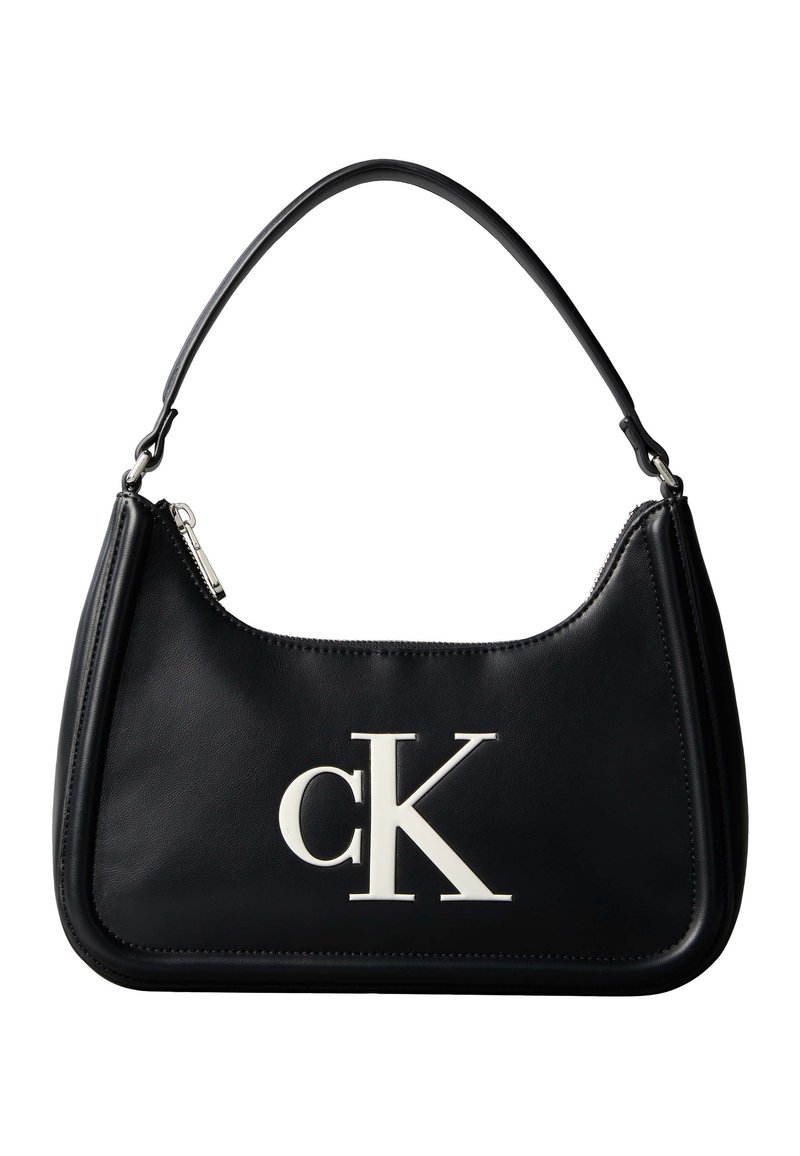 Μαύρη δερμάτινη τσάντα ώμου με ασημένιο φερμουάρ και λευκό λογότυπο «cK» στο κέντρο του μπροστινού μέρους.