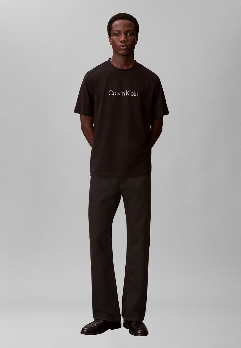 Νέος άνδρας που στέκεται με τα χέρια πίσω από την πλάτη, φορώντας μαύρο t-shirt Calvin Klein, μαύρο παντελόνι και μαύρα παπούτσια, μπροστά από γκρι φόντο.