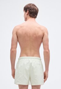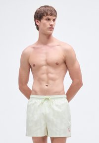 Ριγέ μαγιό βερμούδα σε ανοιχτό πράσινο και λευκό, με ελαστική μέση και κορδόνι ρύθμισης. Ομαλό ύφασμα με άνετη εφαρμογή.