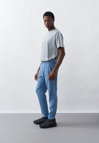 Νέος άνδρας που φοράει γκρι μπλουζάκι Calvin Klein και ανοιχτό μπλε παντελόνι, στέκεται με τα χέρια πίσω από την πλάτη, κοιτάζοντας προς τα αριστερά του.