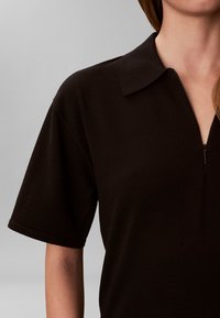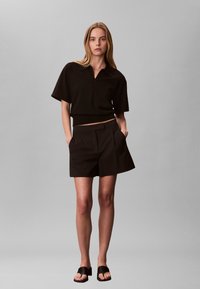 Νεαρή γυναίκα στέκεται με τα χέρια στις τσέπες, φορώντας μαύρο κοντομάνικο μπλουζάκι με γιακά, μαύρο σορτς και μαύρα σανδάλια με ανοικτά δάχτυλα, μπροστά σε γκρι φόντο.