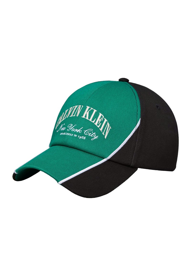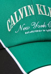 Πράσινο και μαύρο καπέλο μπέιζμπολ Calvin Klein με λευκές ρίγες και το κείμενο "Calvin Klein New York City Established in 1968" στην μπροστινή όψη.