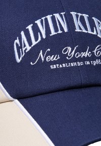 Δίχρωμο καπέλο μπέιζμπολ σε ναυτικό μπλε και μπεζ, με κεντημένο λευκό κείμενο "Calvin Klein New York City" στο μπροστινό πάνελ.