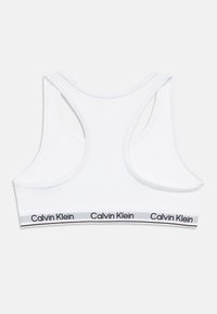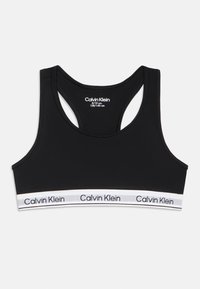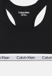 Τρία αθλητικά σουτιέν Calvin Klein racerback σε μαύρο, γκρι και λευκό χρώμα με λωρίδες λογότυπου, τοποθετημένα σε απλό ανοιχτό φόντο.