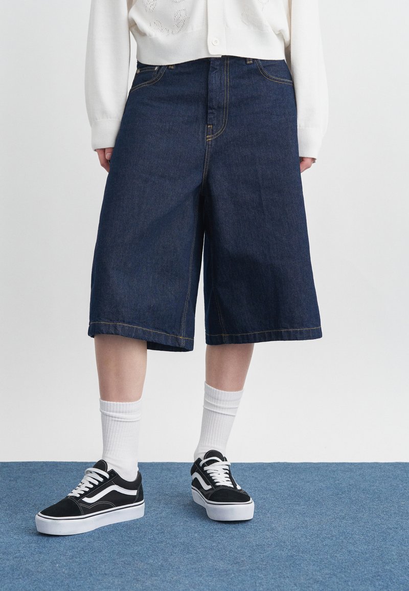 Άτομο που φοράει σκούρα τζιν σορτς με φαρδιά πόδια, λευκές κάλτσες, μαύρα και λευκά αθλητικά παπούτσια και λευκό πουλόβερ με κουμπιά.