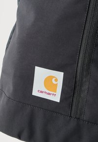 Μαύρη τσάντα ταξιδιού Carhartt με κλείσιμο με κορδόνι και πλευρική λαβή, όρθια σε απλό ανοιχτό φόντο.
