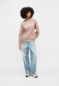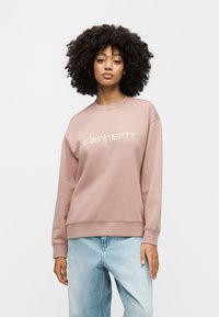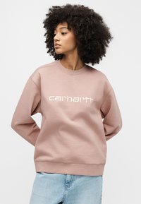 Ροζ φούτερ με στρογγυλή λαιμόκοψη και κεντημένο λογότυπο "Carhartt". Διαθέτει ριμπ μανσέτες και στρίφωμα, συνδυασμένο με ανοιχτό μπλε τζιν.