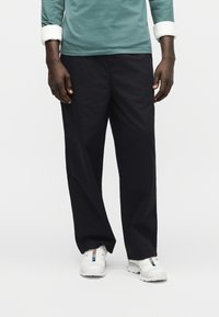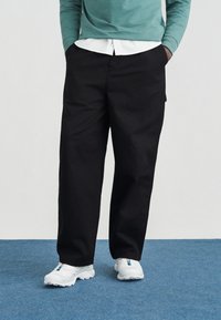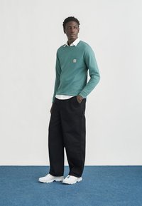 Άτομο που φοράει μαύρο παντελόνι με φαρδιά πόδια, λευκά αθλητικά παπούτσια με μπλε λεπτομέρειες, λευκό πουκάμισο και πράσινο μπλουζάκι με μακριά μανίκια, στέκεται πάνω σε μπλε χαλί.