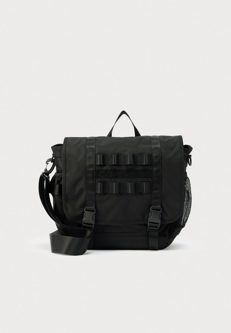 Μαύρη ταξιδιωτική τσάντα τακτικής χρήσης με ρυθμιζόμενο ιμάντα ώμου, εμπρόσθιες αγκράφες, θηλιές και δίχτυνη πλευρική τσέπη σε λευκό φόντο.
