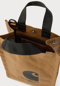 Καφέ ορθογώνια τσάντα tote Carhartt με μαύρο λογότυπο, κοντές λαβές και αποσπώμενο ρυθμιζόμενο μαύρο ιμάντα ώμου σε λευκό φόντο.