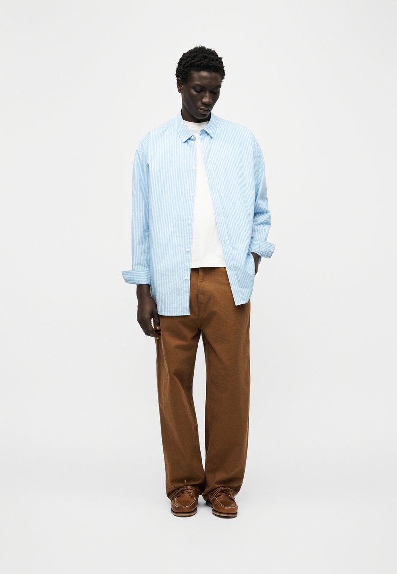 Νεαρός άνδρας στέκεται με το κεφάλι σκυφτό, φοράει ανοιχτό γαλάζιο ριγέ πουκάμισο πάνω από λευκή μπλούζα, καφέ παντελόνι και καφέ παπούτσια σε απλό φόντο.
