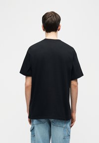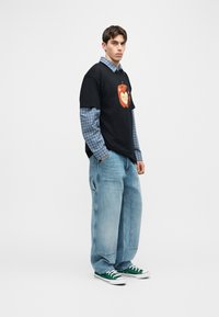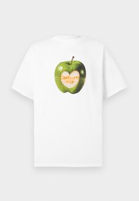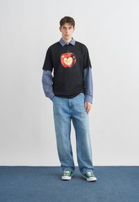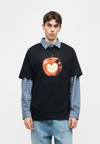 Νεαρός άνδρας που φοράει στρωματωμένο μπλε καρό πουκάμισο και μαύρο t-shirt με κόκκινο μήλο και ξεθωριασμένο τζιν, κοιτάζει προς τα αριστερά του.