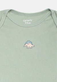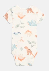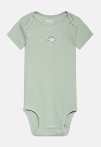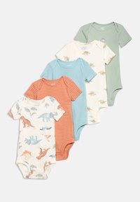 Πέντε μωρουδιακά κορμάκια με κοντό μανίκι σε πράσινο, λευκό με δεινόσαυρους, μπλε, πορτοκαλί ριγέ και λευκό με πολύχρωμα σχέδια δεινοσαύρων, τοποθετημένα σε σχήμα βεντάλιας.
