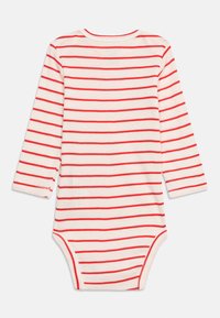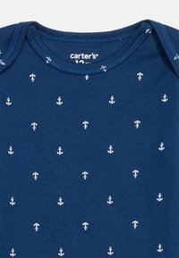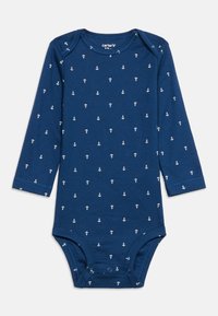 Τέσσερα μακρυμάνικα βαμβακερά κορμάκια για μωρά, με κόκκινες ρίγες, σχέδια με πλοία σε γκρι, μπλε ρίγες και ναυτικό μπλε με λευκούς άγκυρες, τοποθετημένα το ένα επάνω στο άλλο.
