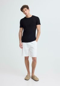 Νεαρός άνδρας στέκεται με το ένα χέρι στην τσέπη, φοράει μαύρο μπλουζάκι, άσπρα σορτς και μπεζ παπούτσια τύπου slip-on μπροστά σε απλό φωτεινό φόντο.