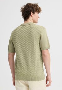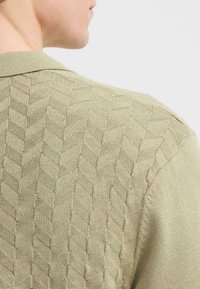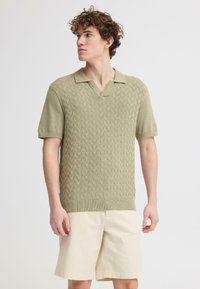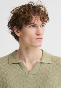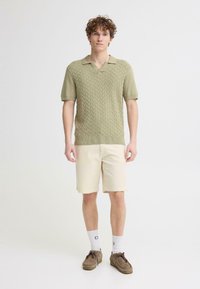 Νεαρός με σγουρά μαλλιά που φοράει πλεκτό πόλο με κοντά μανίκια σε υφή ελιάς και μπεζ σορτς μέχρι το γόνατο, στέκεται μπροστά σε ένα απλό φόντο.