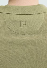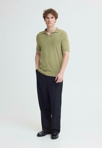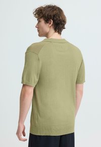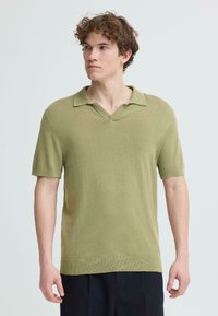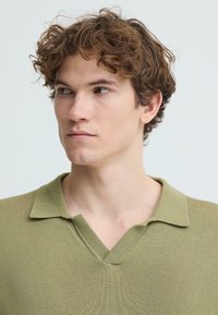 Νέος άνδρας με σγουρά μαλλιά που φοράει ένα ανοιχτό πράσινο πλεκτό πουκάμισο κοντομάνικο με γιακά, κοιτάζοντας ελαφρώς προς τα αριστερά του.