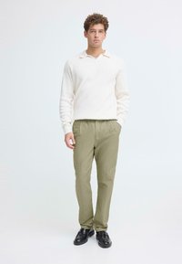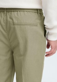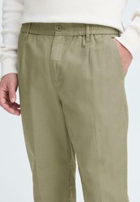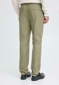 Ανοιχτό πράσινο παντελόνι με χαλαρή γραμμή, ελαστική μέση, κούμπωμα με κουμπί και ομαλή υφή, συνδυασμένο με μαύρα παπούτσια.