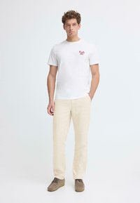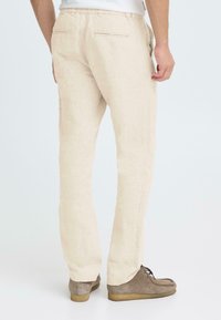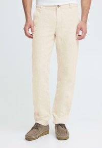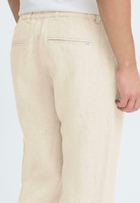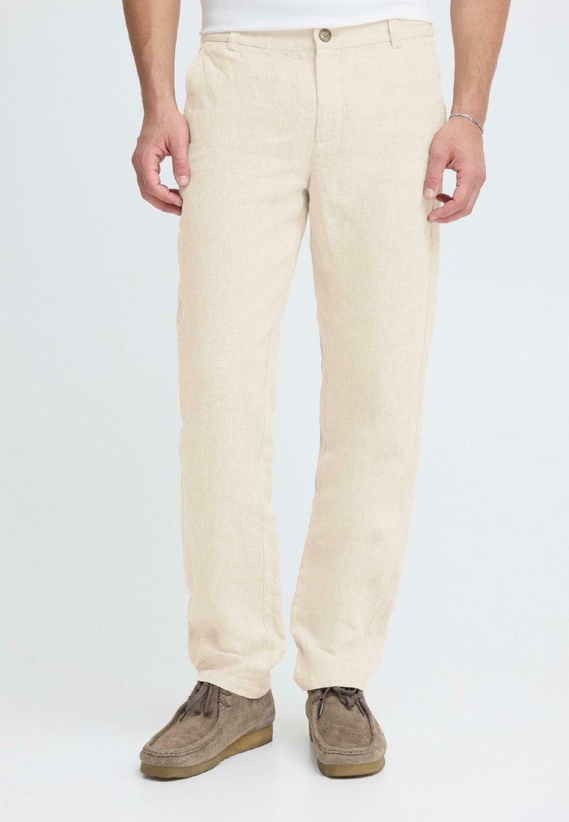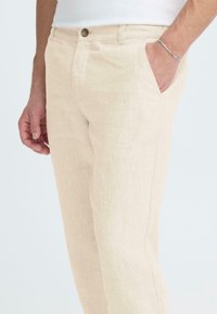 Μπεζ λινά παντελόνια με ίσια γραμμή. Διαθέτουν κλείσιμο με κουμπιά, θηλιές για ζώνη και υφή ύφασμα. Συνδυάζονται με ανοιχτό καφέ παπούτσια.