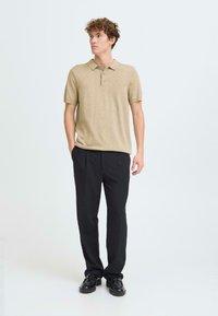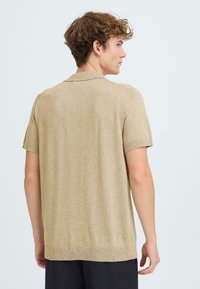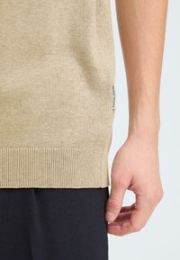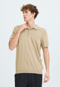 Μπεζ κοντομάνικο πόλο με υφή πλέξης, με διακριτική πατιλέτα με δύο κουμπιά και ριμπ μανσέτες και τελείωμα. Απλός, κλασικός σχεδιασμός.