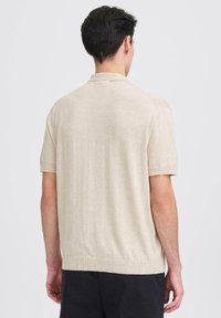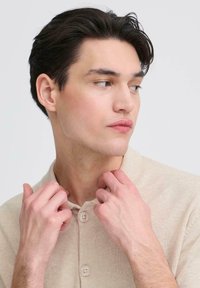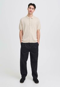 Μπεζ πλεκτό πόλο με κοντά μανίκια και γιακά, διακοσμημένο με κουμπιά στο μπροστινό μέρος. Φορεμένο με σκούρο, άνετο παντελόνι και μαύρα παπούτσια.