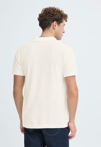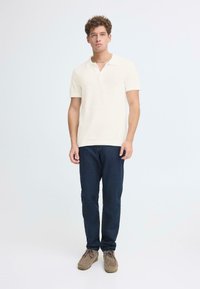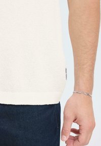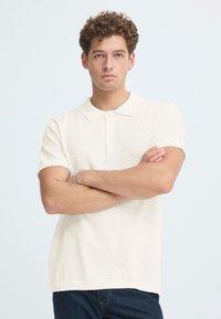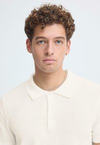 Νεαρός με σγουρά μαλλιά που φοράει λευκό πόλο μπλουζάκι με κοντά μανίκια και σκούρο τζιν, στέκεται με τα χέρια σταυρωμένα μπροστά σε λευκό φόντο.