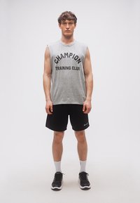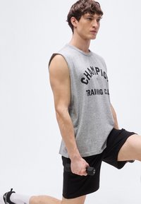Νεαρός άνδρας που φοράει γκρι αμάνικο μπλουζάκι με το κείμενο «CHAMPION TRAINING CLUB», στέκεται μπροστά σε απλό ανοιχτόχρωμο φόντο.