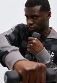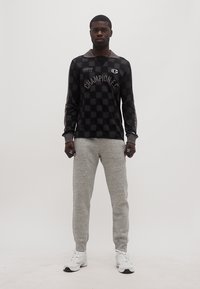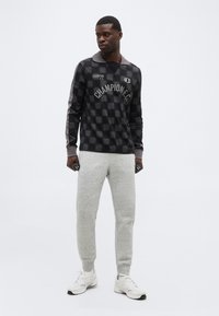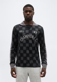 Άνδρας που φοράει μακρυμάνικο πουκάμισο Champion F.C. σε μαύρο και γκρι καρό με γιακά, και ανοιχτό γκρι φόρμα, μπροστά σε απλό φόντο.