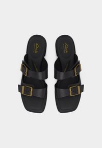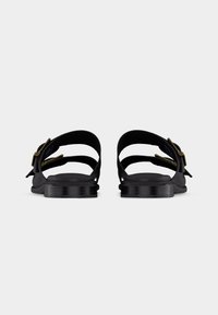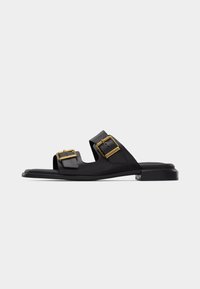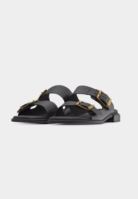 Μαύρο δερμάτινο σανδάλι slide με δύο χρυσές αγκράφες, τοποθετημένο σε μπεζ χαλί σε δωμάτιο κοντά σε στρογγυλό ξύλινο τραπεζάκι καφέ με στοιβαγμένα βιβλία.