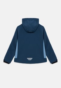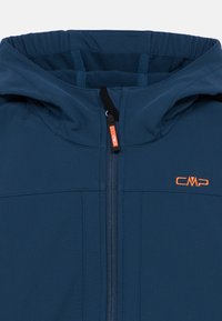 Ναυτικό μπλε μπουφάν softshell με ανοιχτό μπλε πλαϊνά πάνελ. Διαθέτει κουκούλα, μπροστινό φερμουάρ και πορτοκαλί λεπτομέρειες στα φερμουάρ και το λογότυπο.