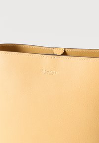 Τσάντα Coach bucket από δέρμα ταμπά με αντίστοιχη αποσπώμενη θήκη, ρυθμιζόμενο λουράκι και διακριτικό ανάγλυφο λογότυπο σε λευκό φόντο.
