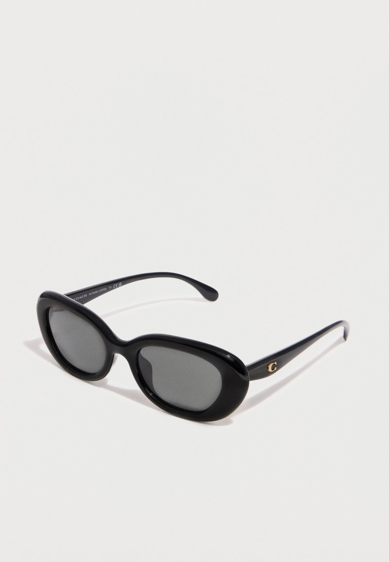 Μαύρα οβάλ γυαλιά ηλίου με σκουρόχρωμους φακούς και χρυσό λογότυπο "C" στο πλαϊνό μέρος, απεικονίζονται πάνω σε απλό λευκό φόντο.