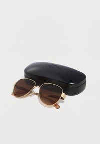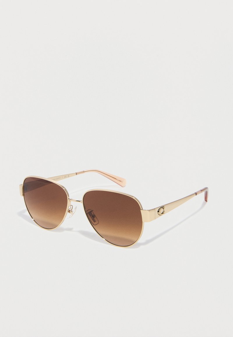 Γυαλιά ηλίου αεροπόρου με χρυσή κορνίζα, φακούς με καφέ διαβάθμιση και λεπτά μεταλλικά μπράτσα, τοποθετημένα σε λευκή επιφάνεια.