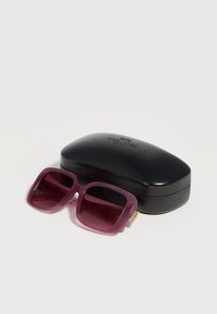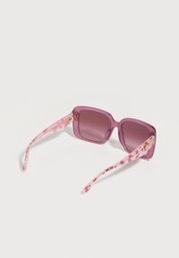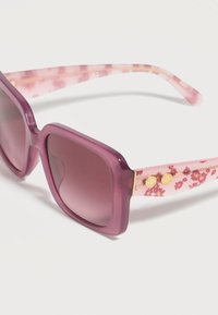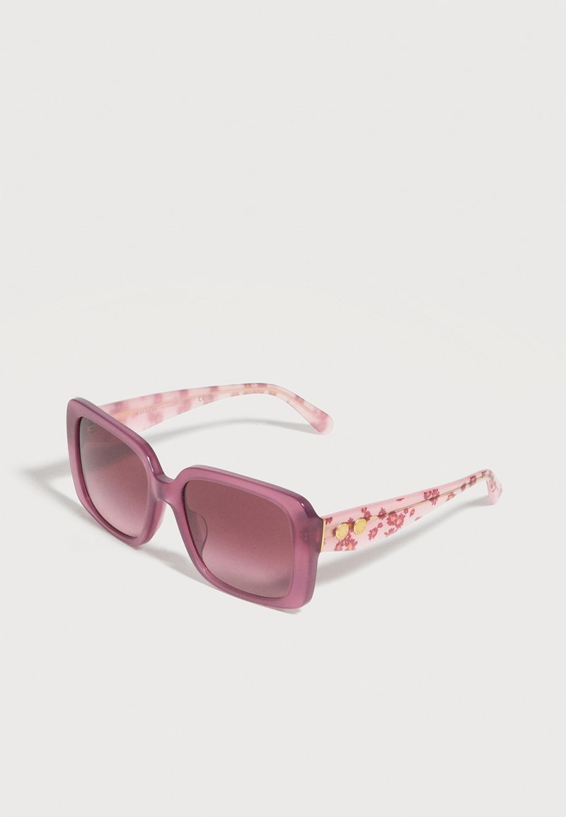 Τετράγωνα μωβ γυαλιά ηλίου με φακούς με διαβάθμιση και ροζ βραχίονες με λουλουδάτο μοτίβο, featuring δύο μικρά χρυσά καρφιά σε κάθε πλευρά.