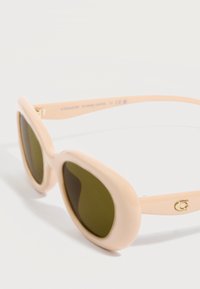 Κρεμ οβάλ γυαλιά ηλίου με σκούρους φακούς και μικρό χρυσό λογότυπο στον βραχίονα, εμφανιζόμενα πάνω σε απλό ανοιχτό φόντο.