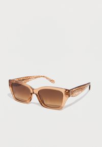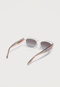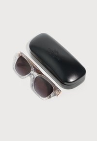 Γυαλιά ηλίου με διαφανές σκελετό, τετράγωνα σκουρόχρωμα φακούς με βαθμιαία σκίαση και μπεζ μοτίβο μαρμάρου στα πλαϊνά, με μικρό χρυσό λογότυπο Coach.