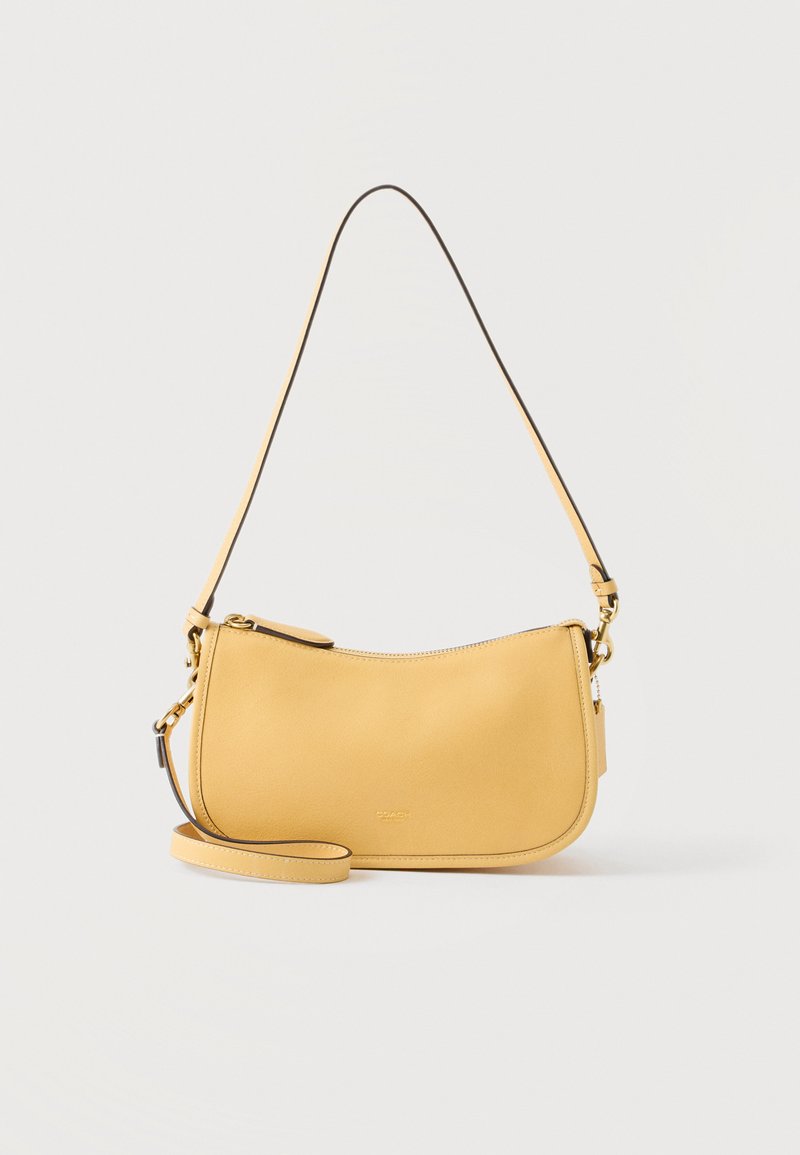 Κίτρινη δερμάτινη τσάντα ώμου με καμπυλωτό φερμουάρ στην κορυφή και λεπτό ρυθμιζόμενο λουράκι, μινιμαλιστικός σχεδιασμός σε απλό φόντο.