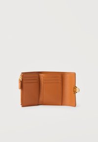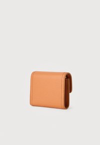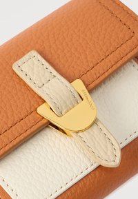 Μικρό πορτοφόλι από δερμάτινη επιφάνεια σε αποχρώσεις ταμπά και κρεμ με υφή, με πόρπη χρυσού τόνου στο μπροστινό κέντρο, πάνω σε λευκό φόντο.