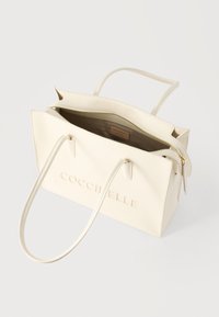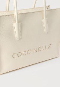 Τσάντα tote από δέρμα σε κρεμ χρώμα με διπλές λαβές και το λογότυπο "COCCINELLE" ανάγλυφο μπροστά.