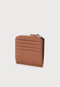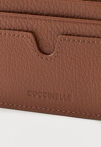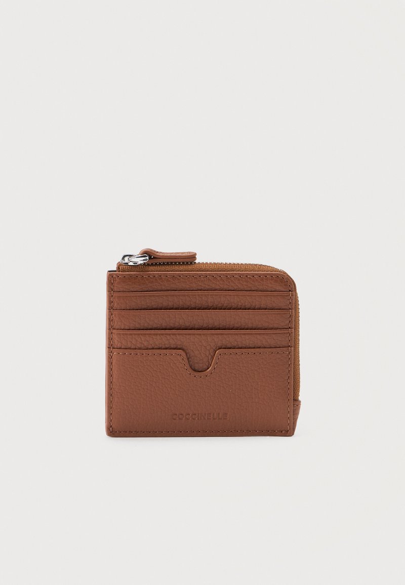 Καφέ δερμάτινο πορτοφόλι με τέσσερις θήκες καρτών και επάνω θήκη με φερμουάρ, συμπαγές σχέδιο με υφή στην επιφάνεια.