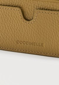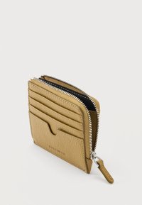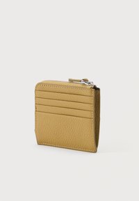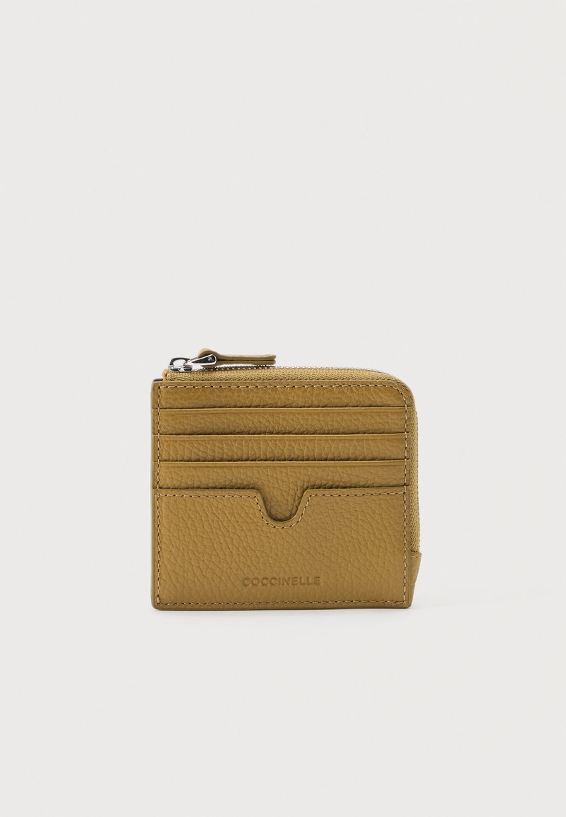 Συμπαγές πορτοφόλι σε καφέ απόχρωση με φερμουάρ, τέσσερις θέσεις για κάρτες και μια μπροστινή τσέπη, επιφάνεια με υφή και ανάγλυφο όνομα μάρκας.