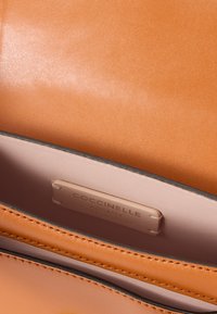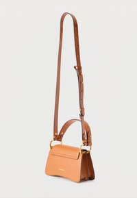 Τσάντα χειρός από δέρμα ταμπά με χρυσό κούμπωμα και αποσπώμενο ιμάντα, κυρτή λαβή στο πάνω μέρος και δομημένο κλείσιμο τύπου φάκελου σε μονόχρωμο φόντο.