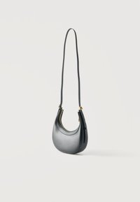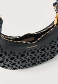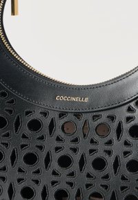 Μαύρη δερμάτινη τσάντα χειρός σε σχήμα μισοφέγγαρου με κυκλικές οπές, χρυσό λογότυπο "COCCINELLE", μονό χερούλι και κλείσιμο με φερμουάρ σε κάθε πλευρά.