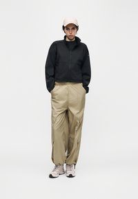 Νεαρό άτομο που φοράει μαύρο μπουφάν με φερμουάρ, μπεζ παντελόνι και ανοιχτό μπεζ καπέλο, στέκεται μπροστά σε απλό ανοιχτό φόντο.
