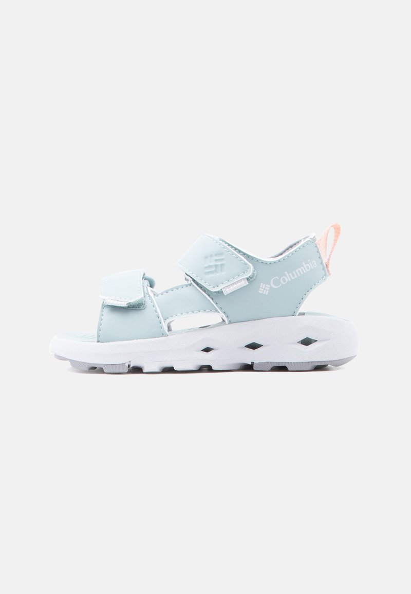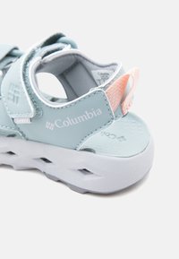 Ανοιχτό μπλε σανδάλι Columbia με ρυθμιζόμενους ιμάντες, μαλακή λευκή σόλα και ροδακινί λουράκι στη φτέρνα, σχεδιασμένο για άνεση και υπαίθρια χρήση.