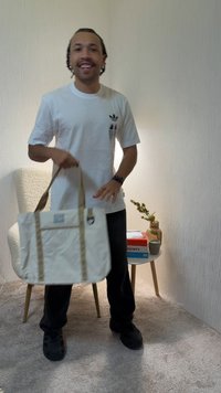 Μπεζ τσάντα ώμου από νάιλον με δύο λαβές από ταμπά ύφασμα, μπροστινή τσέπη με κούμπωμα τοκά, και μια μαύρη ετικέτα με το λογότυπο. Διαθέτει γάντζο στο πλάι.