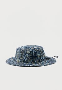 Καπέλο τύπου bucket σε ναυτικό μπλε χρώμα με φαρδύ γείσο, διακοσμημένο με μπεζ τροπικό σχέδιο και ρυθμιζόμενο κορδόνι στο πηγούνι με μηχανισμό κλειδώματος, τοποθετημένο επίπεδα σε λευκό φόντο.